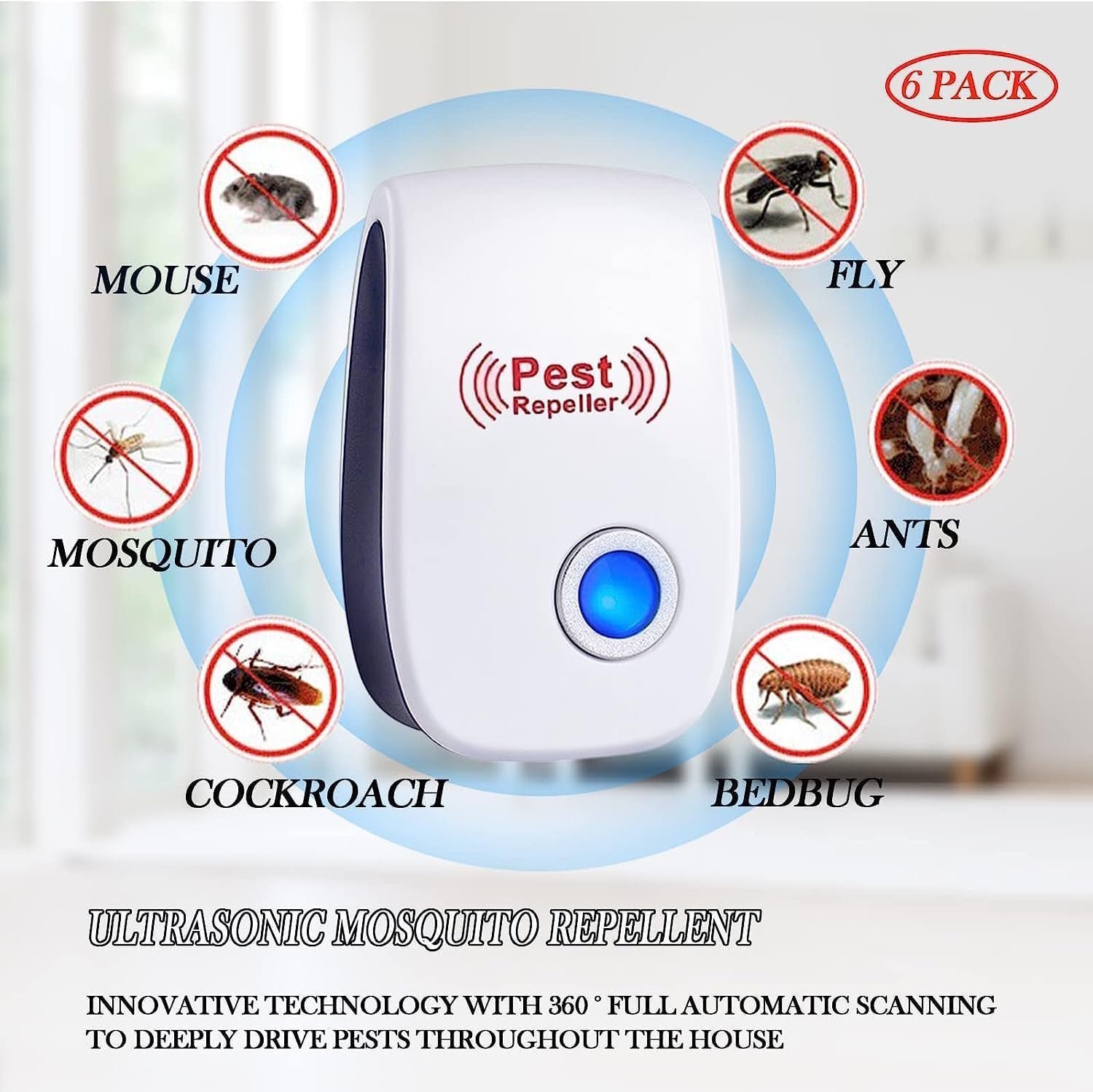 • مكافحة شاملة للآفات: يطرد الفئران، الجرذان، البعوض، الصراصير، النمل، العناكب والقوارض باستخدام الموجات فوق الصوتية.