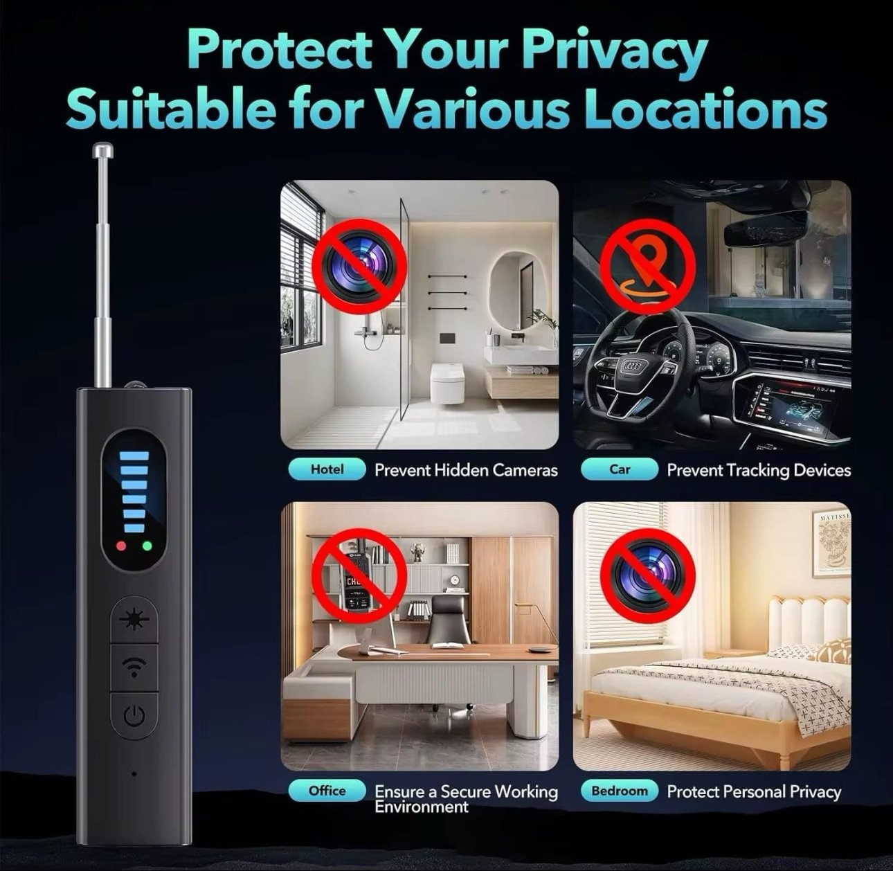 • اكتشاف أجهزة التتبع والكاميرات المخفية.