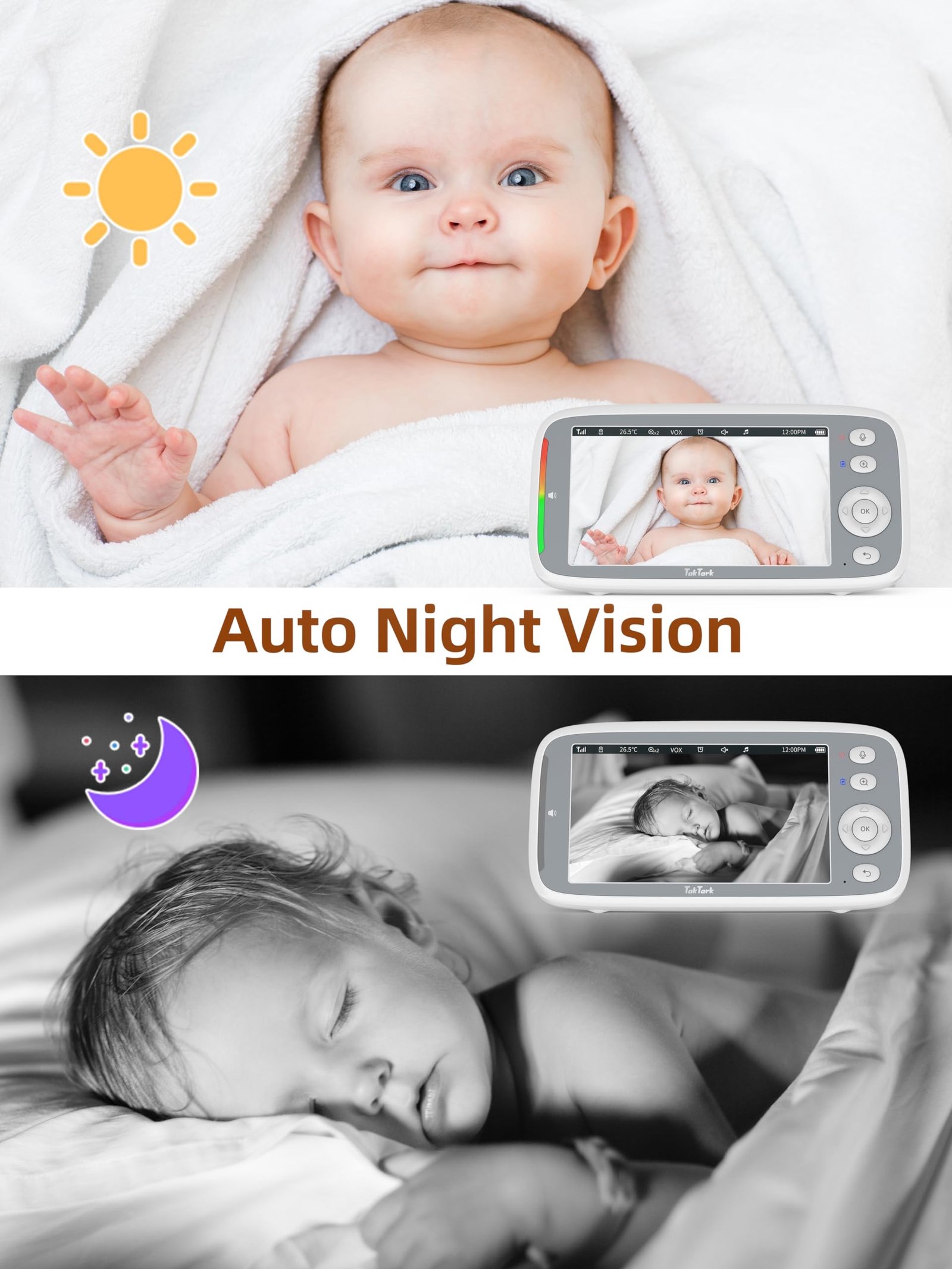 • رؤية ليلية تلقائية بالأبيض والأسود بدون إزعاج الطفل