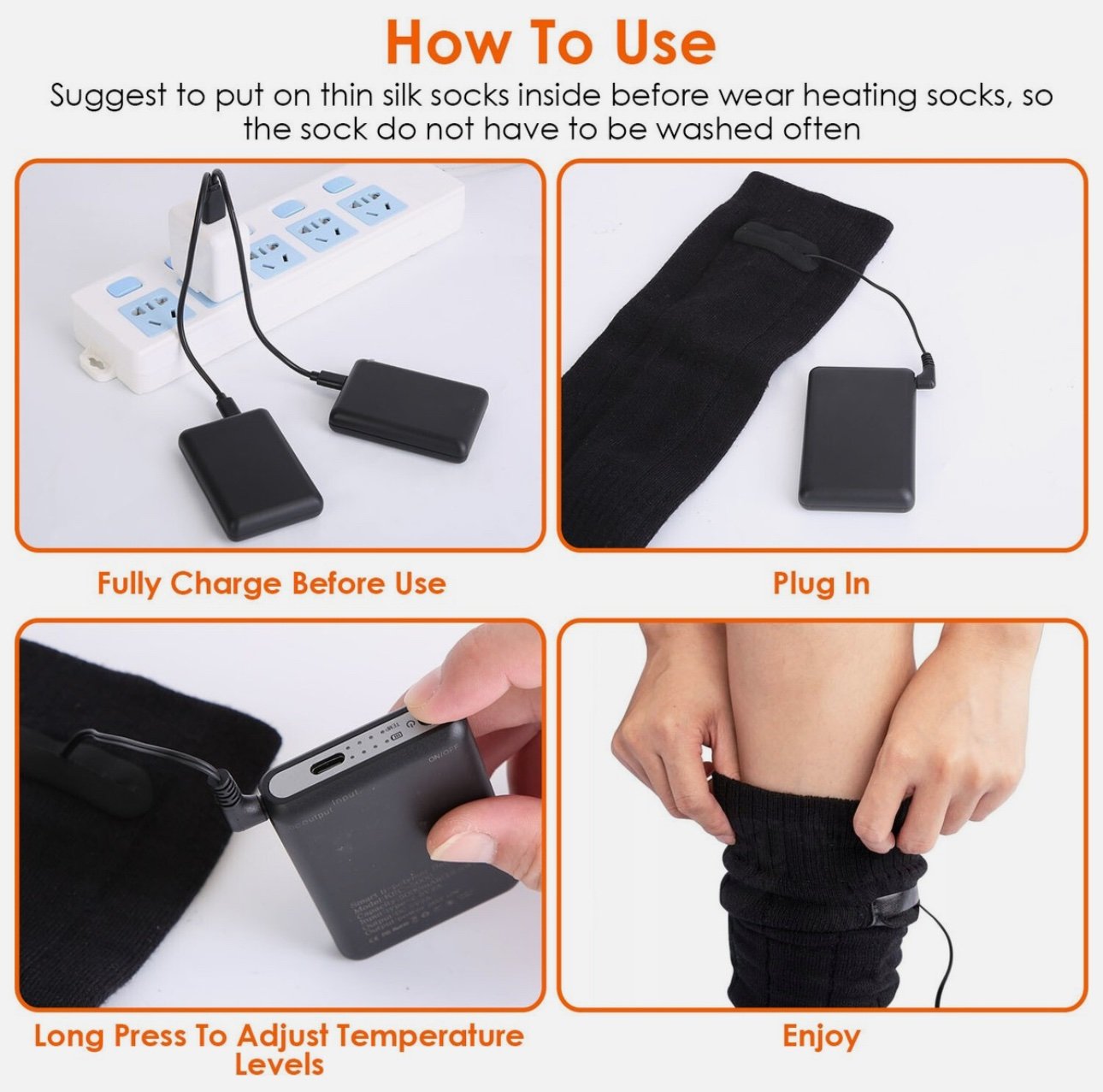 • تتضمن العبوة: زوج جوارب ايفينتك الحرارية، بطاريات قابلة للشحن، كابل USB ودليل استخدام