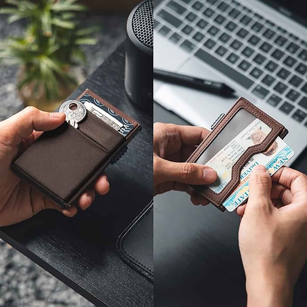 حامل بطاقات فائق النحافة بحماية RFID ونافذة هوية شفافة