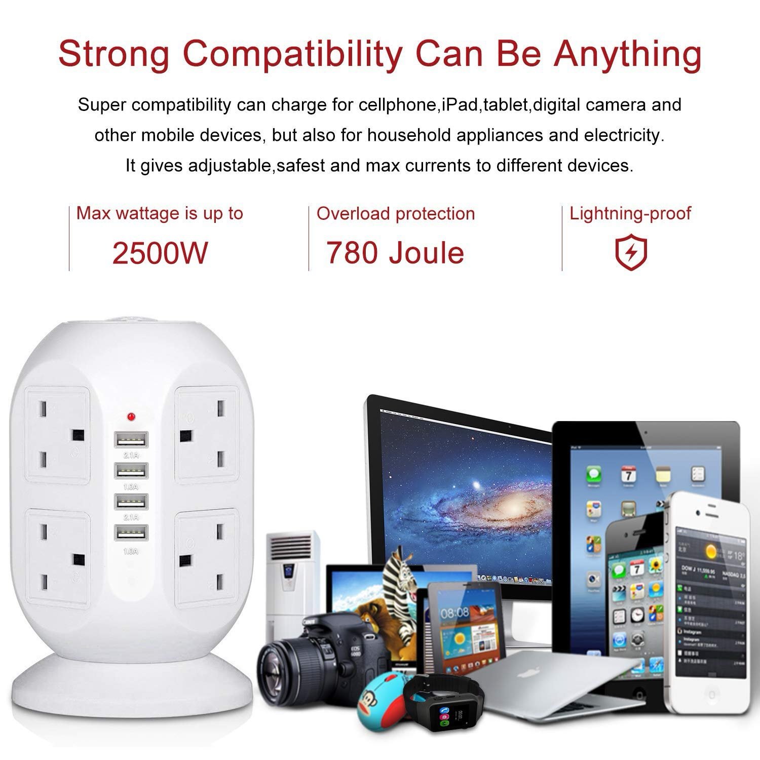 سيار كهرباء بشكل برجي lngxUK بطول كيبل 3 أمتار – 8 منافذ + 4 USB