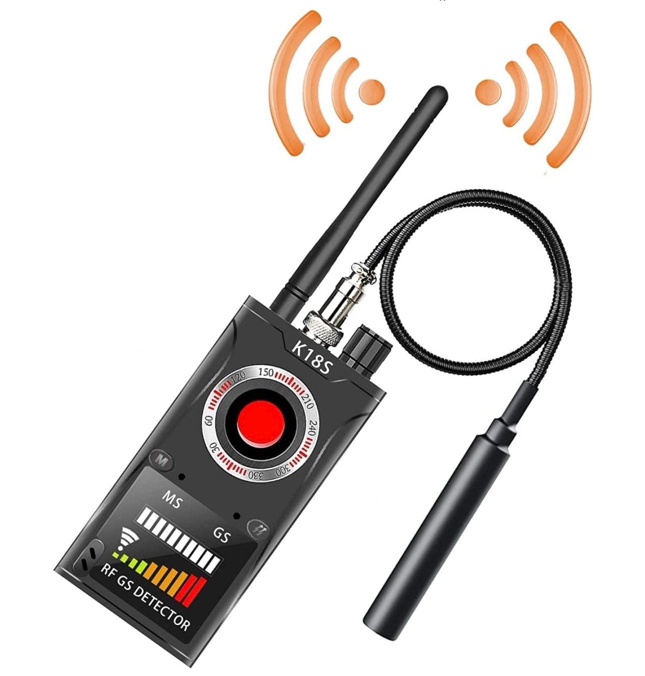 • جهاز كشف متقدم يجمع بين رصد إشارات الترددات اللاسلكية (RF)، المجال المغناطيسي، وعدسات الكاميرات المخفية السلكية واللاسلكية في جهاز واحد.