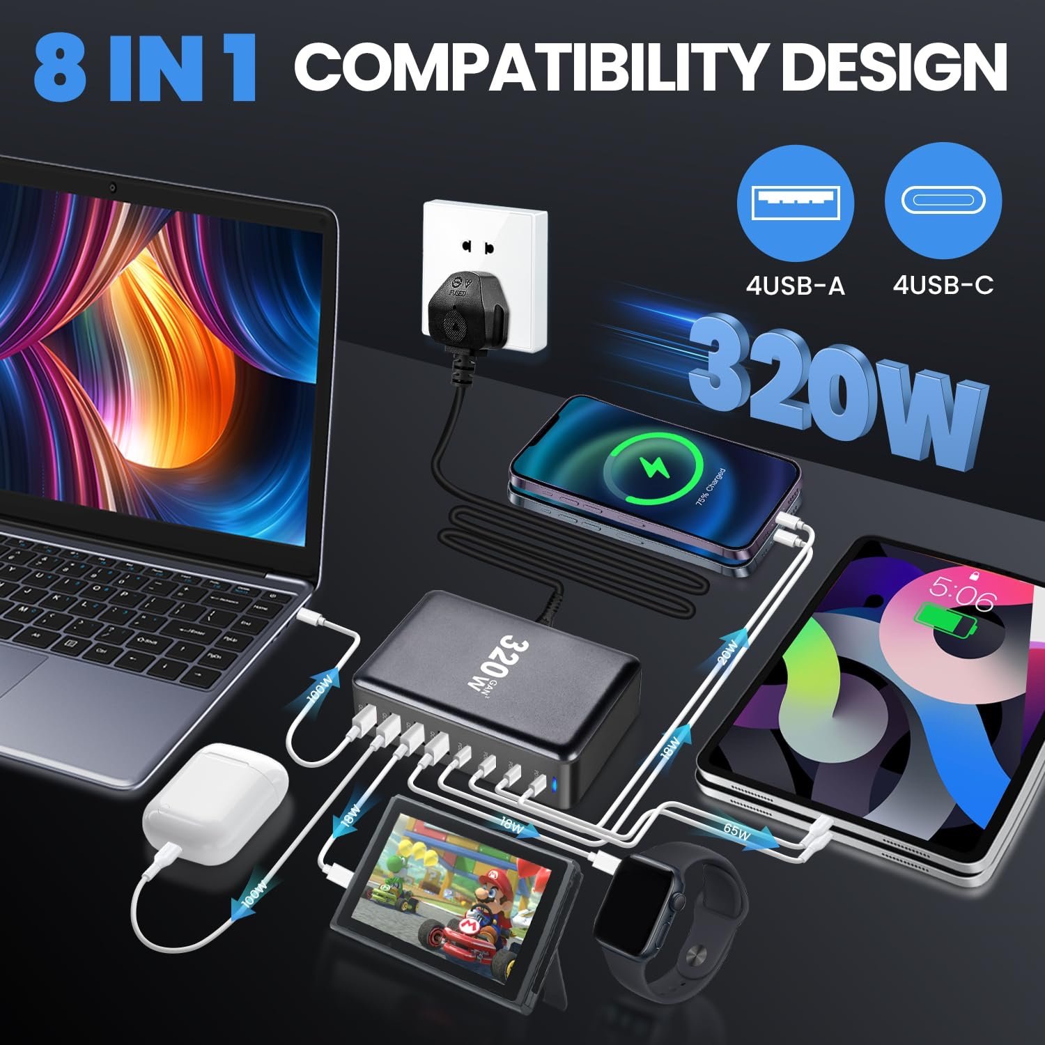 محطة شحن بقوة 320 واط مثالية لجميع أجهزتك — قوة وأناقة في جهاز واحد!