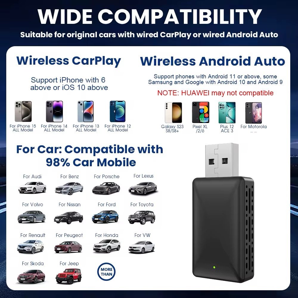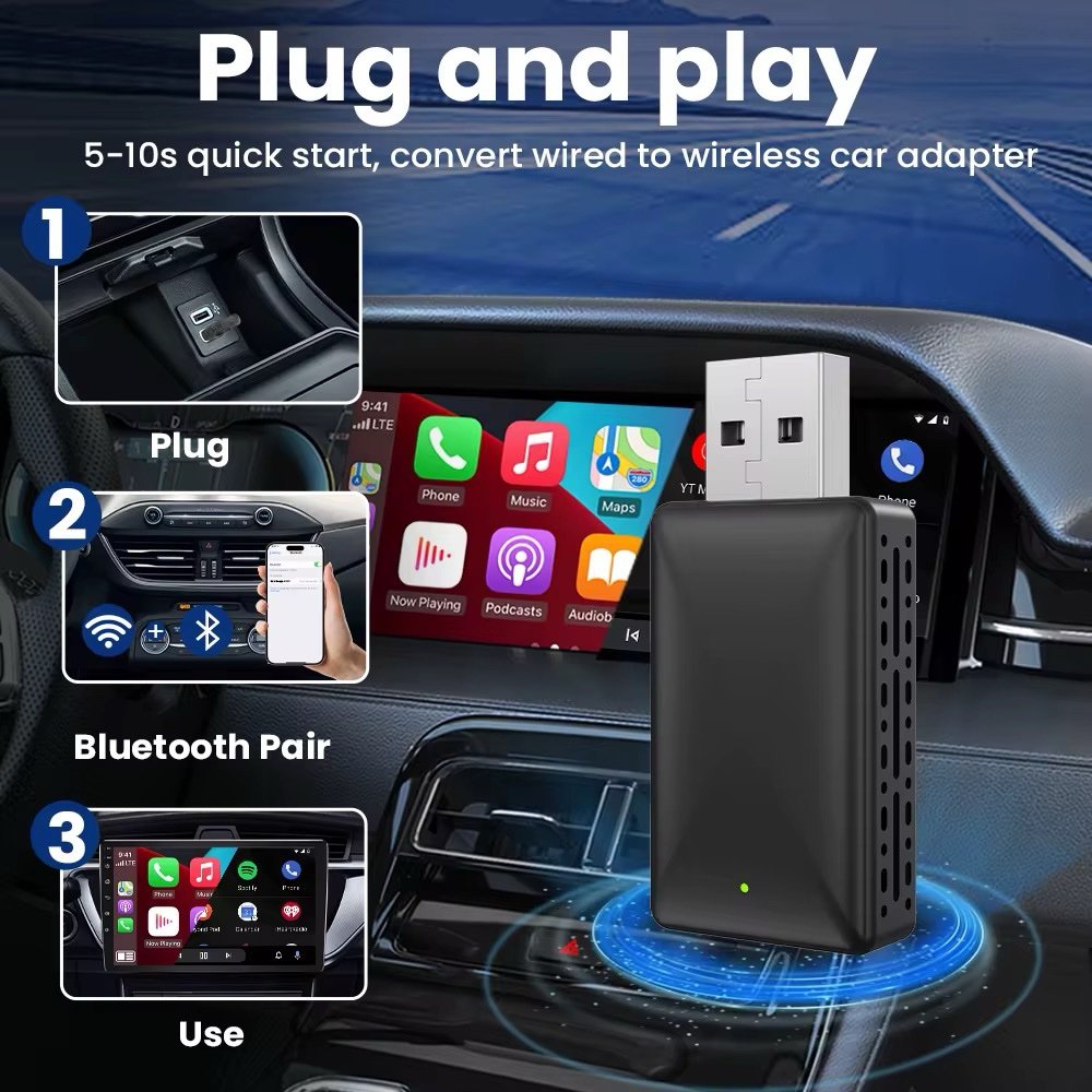 • يحوّل كاربلاي واندرويد أوتو من سلكي إلى لاسلكي بسهولة دون الحاجة لتوصيل الهاتف كل مرة