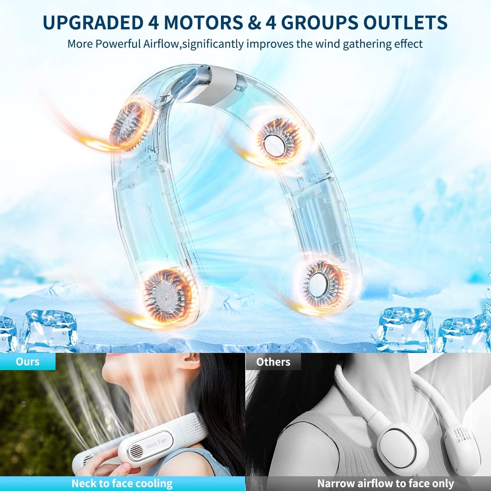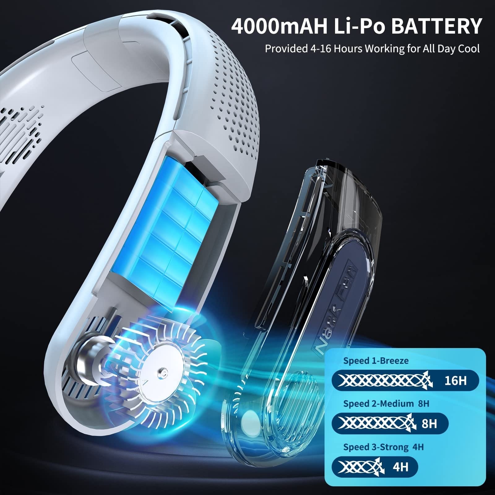 توفر تبريد 360°، مع قابلية تعديل الزاوية 45° لتوجيه الهواء من الرقبة إلى الوجه.