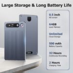 • مساحة تخزين كبيرة وعمر بطارية طويل: ذاكرة 64 جيجابايت تكفي حتى 480 ساعة تسجيل، مع 32 ساعة تشغيل متواصل بعد شحن لمدة ساعتين.