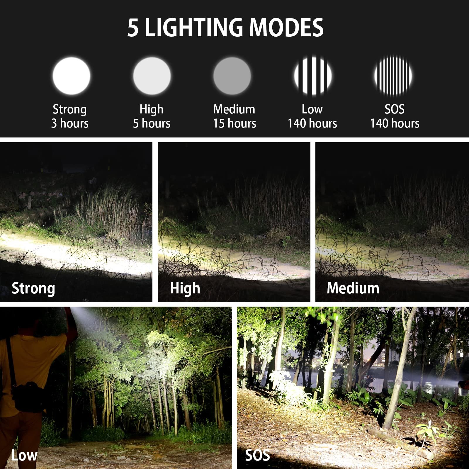 • 5 أوضاع إضاءة مختلفة لتناسب جميع الاستخدامات (قوي – متوسط – منخفض – وامض – SOS)