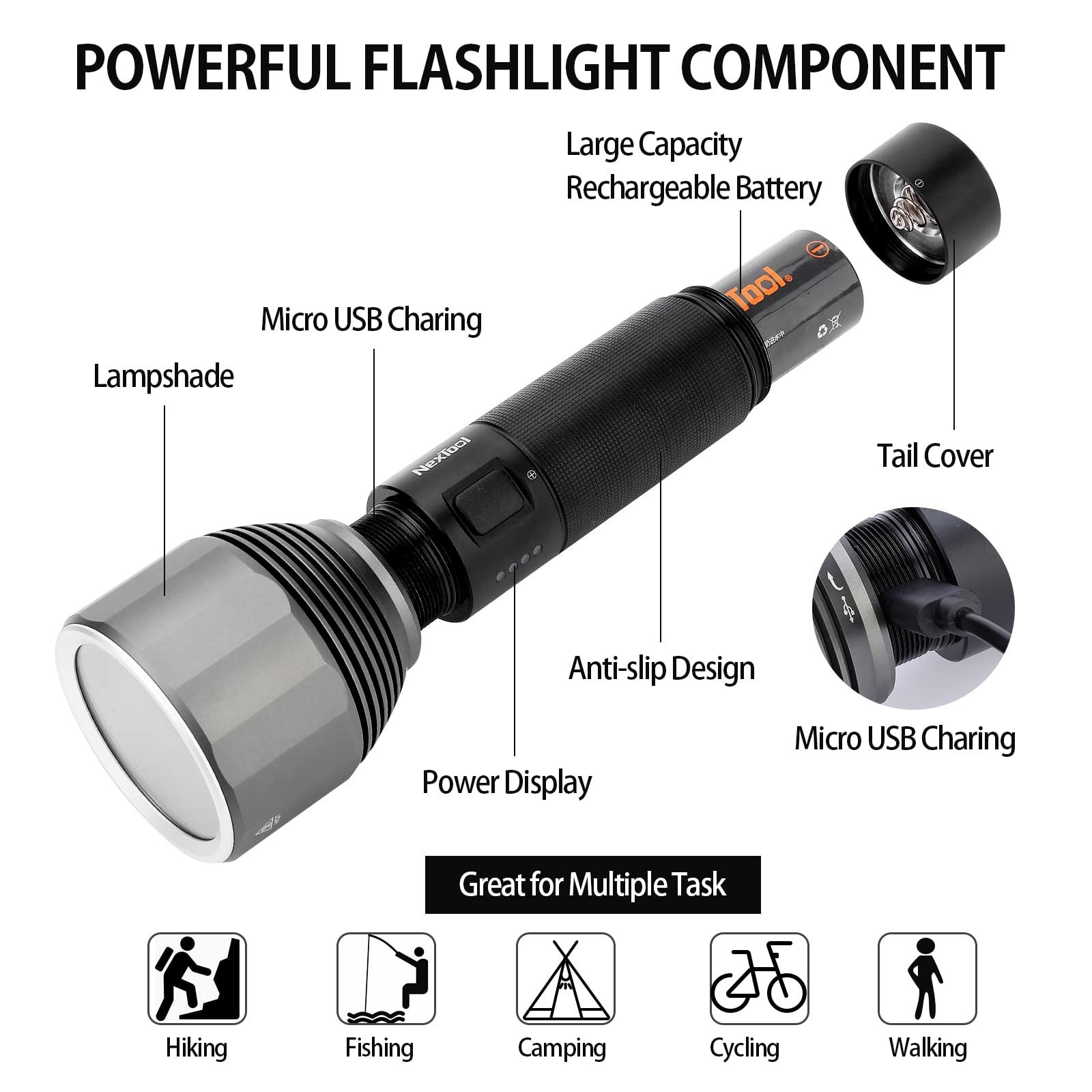 مصباح يدوي احترافي من Nextool بقوة 2000 لومن – إضاءة بعيدة حتى 380 متر مع بطارية قابلة للشحن