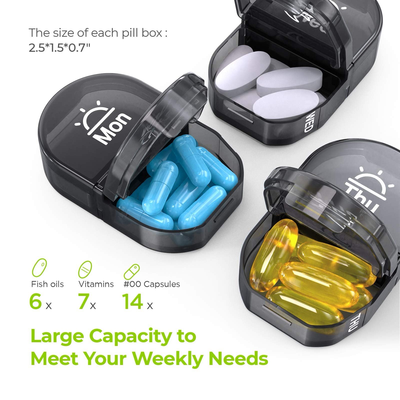 سعة كبيرة تستوعب عدة كبسولات وفيتامينات لكل جرعة