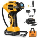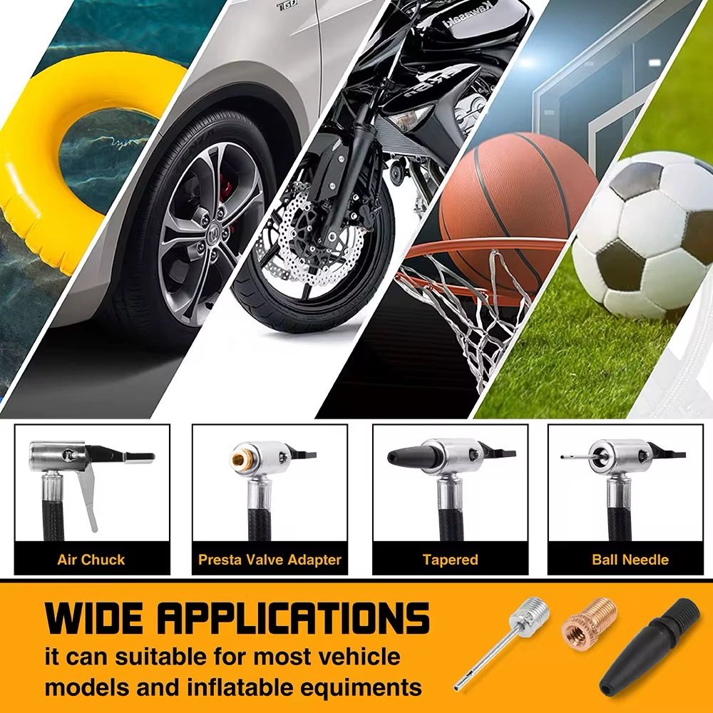 تمتع بالراحة والأمان مع منفاخ الإطارات المحمول الذي يعمل ببطارية ليثيوم قابلة للشحن أو عبر جداحة السيارة 12V. الحل الأمثل لنفخ الإطارات، الدراجات والكرات بسرعة وسهولة.