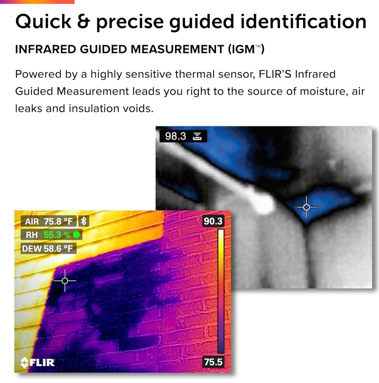 • كشف سريع لمناطق المشاكل مثل الرطوبة، تسربات الهواء، وفراغات العزل بفضل دقة تصوير حراري أعلى بأربع مرات من أنظمة IGM التقليدية.